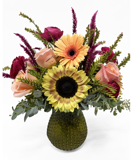 Send autumnal blessings and bliss with this beautiful colored glass vase full of the season's finest stems. A combination of roses, sunflowers, ranunculus, celosia, and elegant greens are artfully arranged in this stunning vase design- the perfect size for a dining table or countertop display to celebrate or commemorate any special occasion.