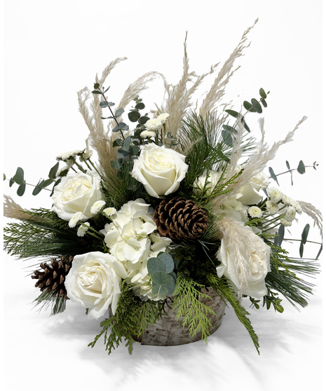 Bring the outdoors inside with the timeless and elegant holiday centerpiece of mixed evergreens and classic white florals with pampas grass accents styled in a wooden birch vessel.