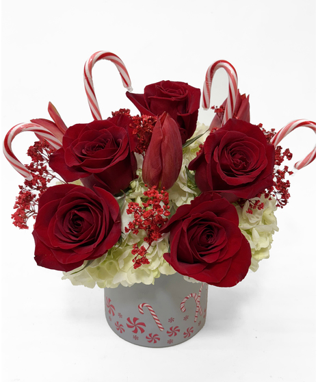 Take them for a trip down Candy Cane Lane with this minty bouquet of red & white florals and real candy cane picks. Choose the deluxe version to upgrade the carnations to roses and tulips.