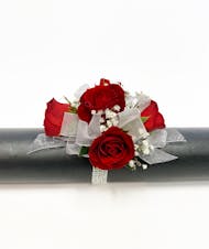 A corsage can be worn on the wrist or pinned to the left side of a dress or blouse, ideally above the heart. If wearing a wrist corsage, place it on the non-dominant hand for comfort and ease. Pin-on corsages should be securely attached to avoid movement while being worn.