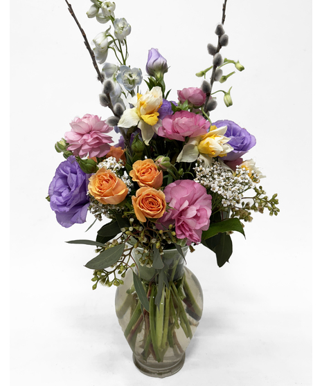 The sweet scent of spring and the glistening of dewdrops, this medium sized arrangement is the embodiment of spring time. A pastel mix of daffodils, lisianthus, sweetheart roses and other delicate blooms is the perfect assortment to bring peace and comfort to someone in need.