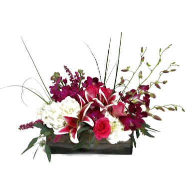 This arrangement is a pink girl's dream and we knew this would be her favorite creation! A lovely wooden container arrives filled with hydrangea, orchids, lilies, roses, stock and seeded eucalyptus.