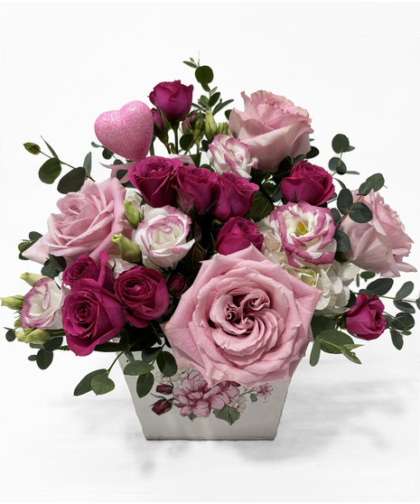 Let love bloom with this gorgeous arrangement of roses in various colors and sizes in a keepsake floral box. For that special someone who makes love grow wherever they are, be sure to let them know they are loved too this Valentine's Day. Arrangement is faced and medium in size.
