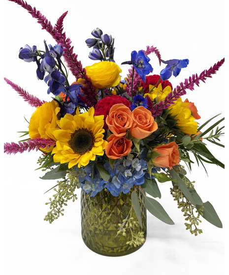 Spread a little fall magic with this dazzling bouquet of boldly saturated flowers in a modern glass vase. A combination of roses, sunflowers, hydrangea, ranunculus, celosia, and eucalyptus greenery will make them feel like royalty.