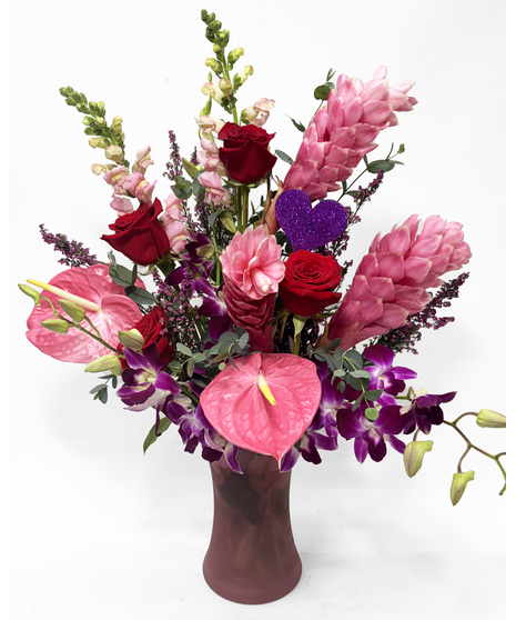 Turn up the heat this Valentine's Day with a tropical design of exotic flowers for that special someone. A mix of anthurium, ginger, orchids, roses, snapdragons and more styled in a frosted glass vase will make it feel like they're on an island vacation this Valentine's Day.
