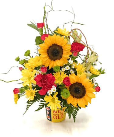 An Eastern Shore favorite. Spice up a loved one's day with this adorable Old Bay soup mug keepsake filled with locally grown flowers in Maryland colors.