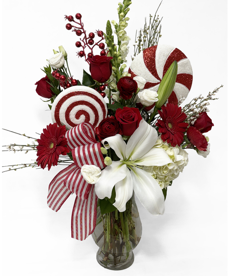 Treat your sweetheart this holiday with our Peppermint Delight bouquet ! This large vase arrangement is brimming with fragrant lilies, roses, evergreens, festive peppermint picks and more. A staff favorite, this bouquet will make a holiday statement.