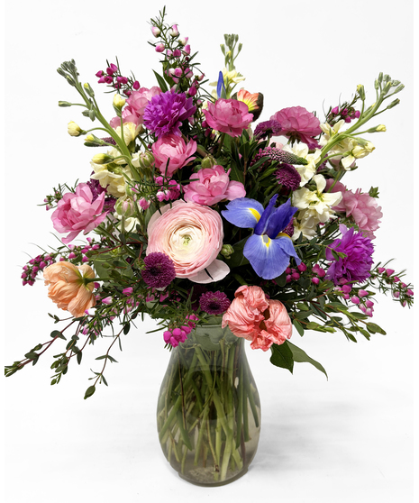 Paint the sky pink with pretty bouquet of pink and pastel blooms. Ranunculus, iris, stock, carnations, and other brilliant spring time blooms will warm their heart and fill them with love.