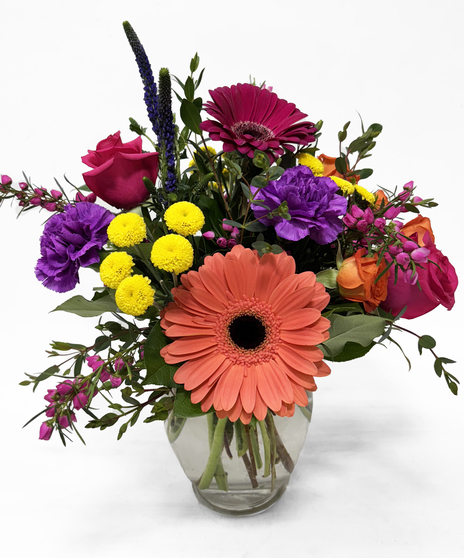 Need to send something to brighten their day? This medium vase arrangement is like sunshine in a jar. This vibrant medley includes carnations, gerbera daisies, roses, mums, and seasonal fillers in rich jewel tones.