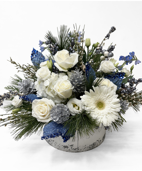 Our 'Winter Wonderland' has all the dazzling features of a crisp snowy landscape so you can bring the outside in this season. Fluffy white florals, fragrant evergreen pines, icy blue sparkling picks and silver pinecones create a stunning snowy centerpiece for your holiday gathering.