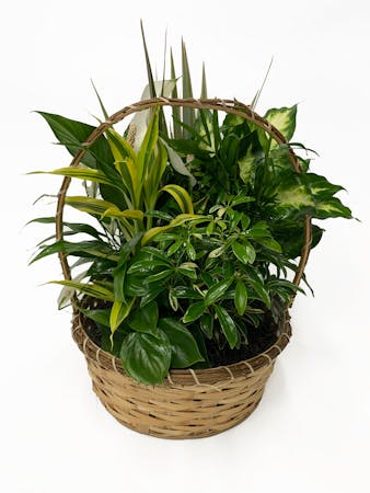 Send this beautiful mixture of green plants for any special occasion. A container planted with several species of indoor plants, designed to look like a garden scene.