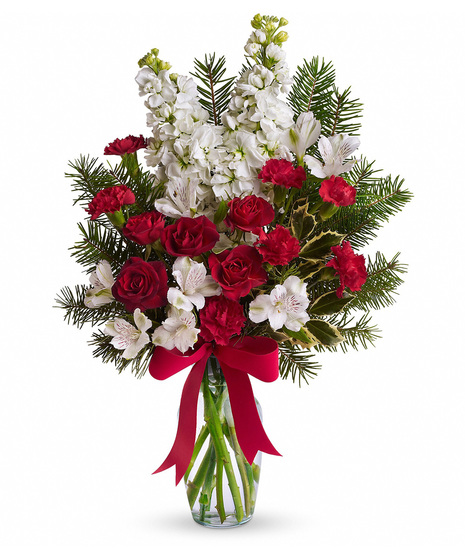 Perfect for holidays or everyday, this delightful array of red and white flowers accented with holly and evergreen is a beautiful bargain. It's an ideal choice for neighbors, teachers, or anyone who brings something special to your life.