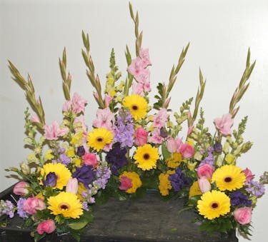 This lovely urn ring is a beautiful way to express a love that is never ending. This design includes roses, tulips, gerber daisies and other seasonal flowers. Please Note Urns are not included.
