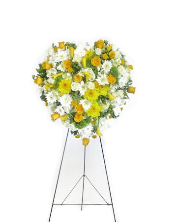 The FTD Glowing Ray Standing Heart is an exquisite way to show your love and affection for the deceased. A collection of sunlit blooms, including, yellow roses, mini calla lilies, and button poms are accented with green hydrangea, white chrysanthemums, cream roses and green hypericum berries to form a sophisticated heart-shaped arrangement that offers a bright and elegant expression of caring kindness for their final goodbye. Displayed on a wire easel.